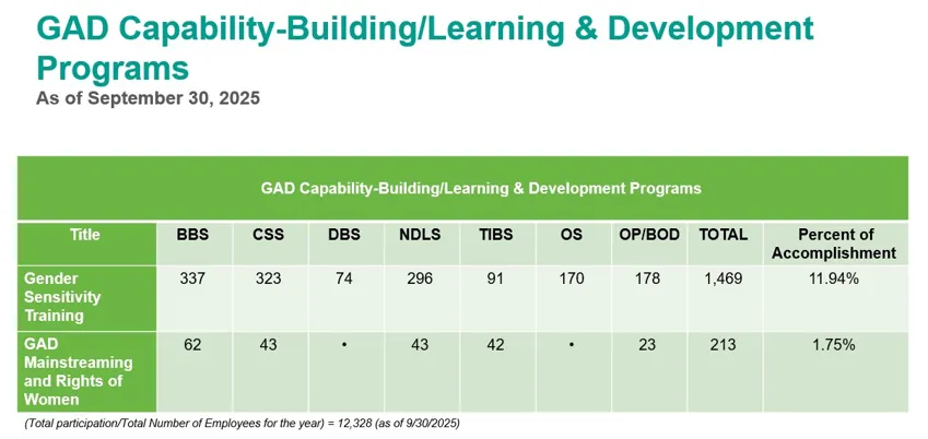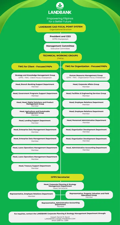 In support of the government’s thrust to mainstream GAD in the policies, programs and activities of government agencies, LANDBANK strengthened its GAD Focal Point System (GFPS) iin 2024 through its Reconstitution of The Landbank Gender and Development Focal Point System (GFPS) And Creation of Various Field GFPS, and capability building of key personnel in 2020.